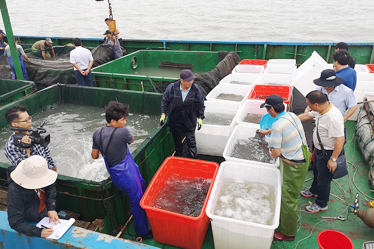 上午8時,東臺公司、東臺市農業農村局、公證處等部門負責人和漁業技術專家及漁民代表乘船從如東太陽島重件碼頭出發,10時抵達東臺市145漁區,2019年度增殖放流活動正式開始。省海洋漁業指揮部、省漁業技術推廣中心、東臺市漁業技術站的專家對苗種品種、規格、數量及質量等指標進行現場檢查、嚴格把關,保障放流苗種質量安全。隨后,工作人員將超過860萬尾的大黃魚和大黃魚標志魚苗種投放大海,苗種金額達450萬元。