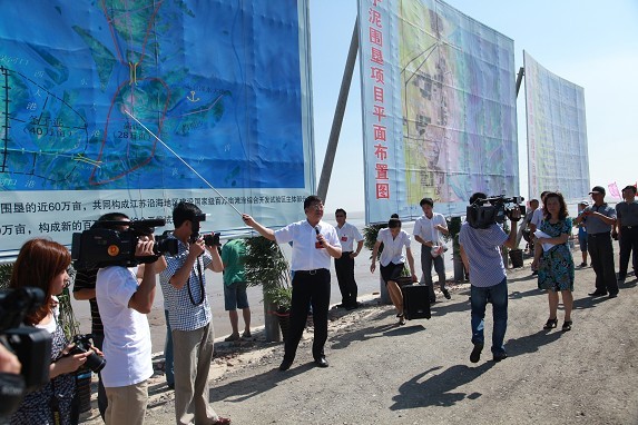2012年7月28日上午,條子泥匡圍項(xiàng)目工地彩旗招展,氣球飄揚(yáng),省沿海開發(fā)推進(jìn)會的代表冒著高溫酷暑蒞臨現(xiàn)場參觀考察。參加這次活動的有:在寧省沿海地區(qū)發(fā)展領(lǐng)導(dǎo)小組成員單位主要負(fù)責(zé)人;南通、連云港、鹽城市市委書記、市長、常務(wù)副市長,市發(fā)改委、經(jīng)信委、沿海辦、海洋與漁業(yè)局主要負(fù)責(zé)人,所轄縣(市、區(qū))黨委、政府主要負(fù)責(zé)同志;其他省轄市及所轄縣(市、區(qū))政府主要負(fù)責(zé)同志;全省國家級和沿海三市省級開發(fā)區(qū)主要負(fù)責(zé)同志,共約250人。