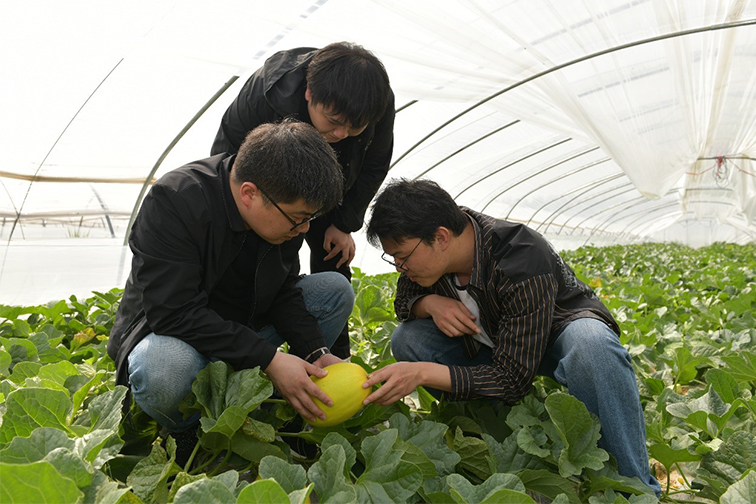 自2019年10月起,金東臺特色瓜果種植青年創新工作室便致力于大棚甜瓜品種篩選及種植試驗研究,成員們一頭扎進田壟之間,悉心耕耘,靜待收獲。“甜瓜的種植條件和西瓜類似,適宜砂質土壤,但對鹽堿較為敏感,要想品質得到充分保證,篩選出適應公司土地的適種品種是首要解決的問題?!弊鳛轫椖控撠熑耍瑢O庭煒回憶起項目實施第一年時的場景?!拔覀儗⑦x取的3個甜瓜品種種植在同一個甜瓜大棚里,各品種相近不相鄰,有著相同的生產管理條件。但當時所處區域部分地塊的堿性過強,部分甜瓜幼苗移栽后很難存活,成熟后品相及口感均不達標。”