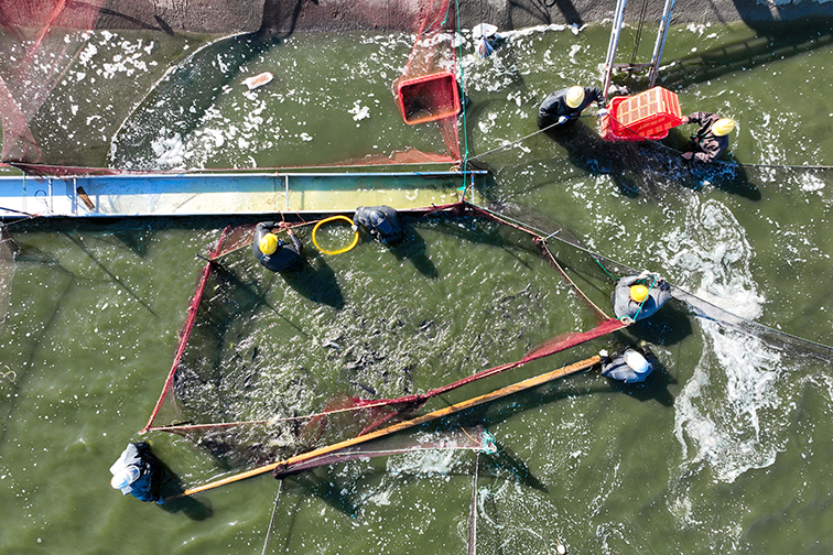 持續多日的晴好天氣讓春天的腳步越來越近,波光粼粼的水面涌動著強信心、促發展的澎湃春潮。正月初七一大早,養殖塘口早已熱鬧起來,三五個身著捕魚服的工人漸漸收攏,一邊拉網,一邊靠向岸邊,齊心協力把一網網鮰魚打撈上岸。在初升朝陽的映襯下,看著肥美鮰魚跳躍歡騰,工人們已是滿眼笑意。