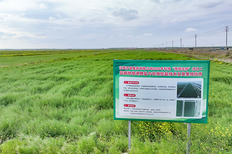 這里毗鄰黃海,部分耕地受土壤鹽分含量高、地下水埋深淺、水質性缺水或季節性缺水等因素影響,土地鹽堿化嚴重且持久反復,土壤亟待改良、地力亟待提升。據相關負責人介紹,2022年初,省沿海集團所屬土地公司通過“揭榜掛帥”形式聯合中國科學院南京土壤研究所和集團所屬科技公司共同開展項目研究,全力培育鹽堿地快速降鹽與長效控鹽關鍵技術,著力解決作物產量低下或絕產等問題。