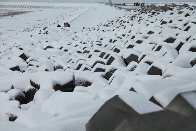 為把此次降雪帶來的影響降到最低,項目參建各方從19日清晨開始,就積極行動起來,投身到清雪戰斗中。各碼頭及預制場利用人員及機械,清掃場內積雪,鏟除作業點周邊主干道的積雪。電力工作者踏著厚厚的積雪,巡查每一條線路,及時排除隱患,保障電力供應。民工工棚區及時清除棚頂積雪,避免大雪壓塌工棚。